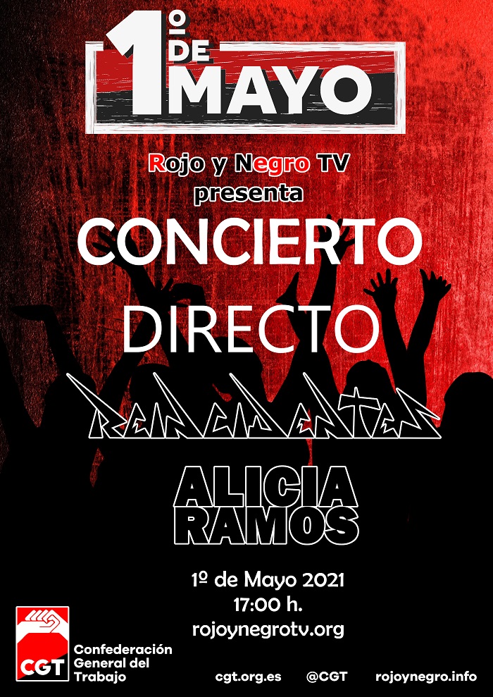 Hemos optado por conmemorar el Primero de Mayo con nuestro ya tradicional concierto. En esta ocasión disfrutaremos de las canciones de Alicia Ramos y Reincidentes. Será el 1º de Mayo, a partir de las 17’00 horas, y a través de la web de Rojo y Negro TV, la televisión de la CGT.