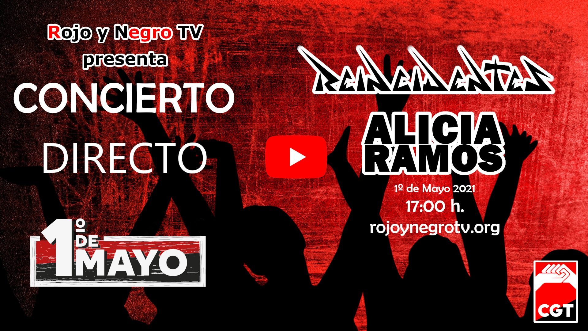 Hemos optado por conmemorar el Primero de Mayo con nuestro ya tradicional concierto. En esta ocasión disfrutaremos de las canciones de Alicia Ramos y Reincidentes. Será el 1º de Mayo, a partir de las 17’00 horas, y a través de la web de Rojo y Negro TV, la televisión de la CGT.