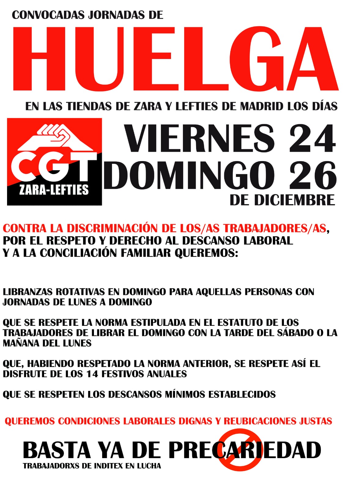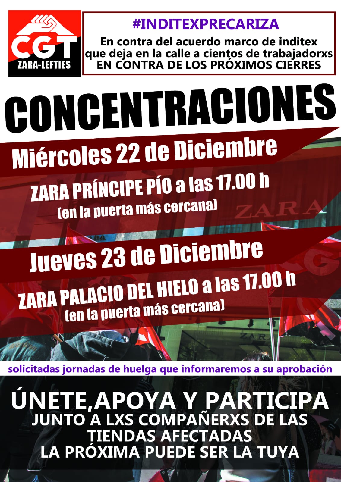 Compañeros/as, os recordamos que la plantilla de Zara y Lefties tiene programadas concentraciones mañana y pasado (días 22 y 23), asimismo se convoca huelga los días 24 y 26.