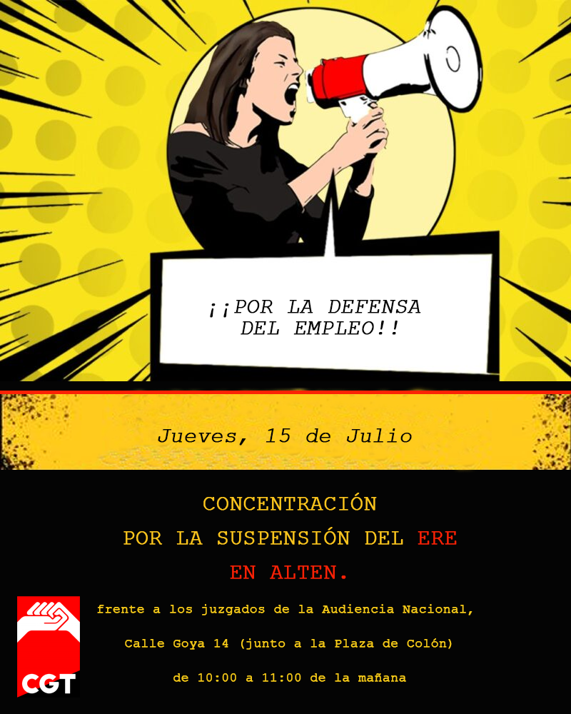 El próximo 15 de Julio, se celebra el juicio por el ERE perpetrado en ALTEN en el mes de febrero que supuso el despido de 187 compañer en s. Ese día, frente a la Audiencia Nacional se ha convocado por parte de la Sección Sindical de CGT una concentración entre 10:00 y 11:00 de la mañana. Os solicitamos a todos los sindicatos apoyo para dicha concentración.