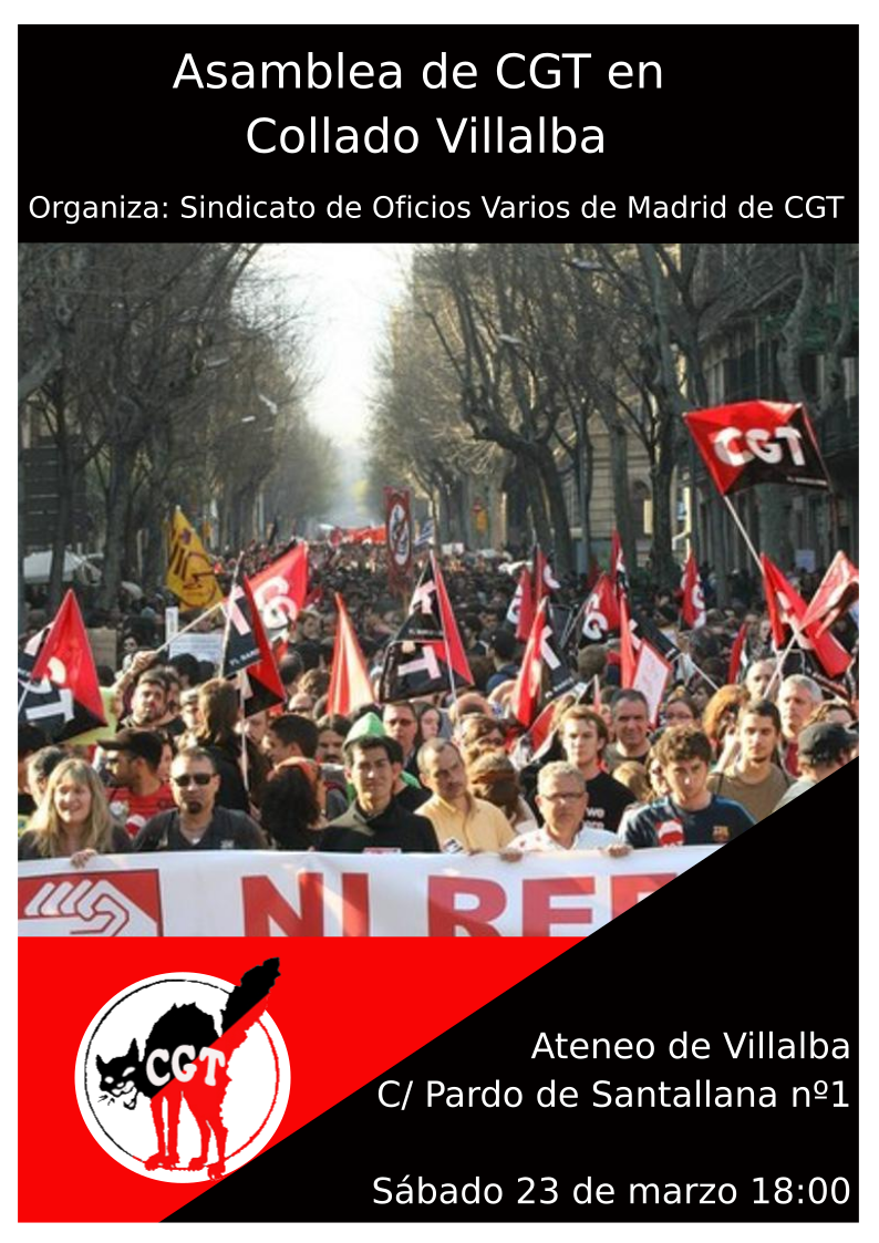 Varias personas afiliadas al sindicato de Oficios Varios de Madrid de la CGT queremos promover la creación de un espacio para la afiliación de la CGT en Villalba que de cabida y respuesta a las necesidades de organización de las personas afiliadas que vivimos en la zona noroeste de la Sierra. Para ello convocamos una primera asamblea que se celebrará el sábado 23 de marzo de 2024 en el Ateneo Popular de Collado Villalba (Calle Pardo de Santallana 1, esquina Serafín Gómez Bonilla) a las 18:00 en la cual se tratará el siguiente orden del día: