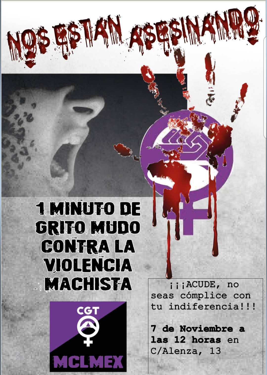 El primer jueves de cada mes como muestra de repulsa ante los feminicidios guardaremos un minuto de silencio. Por ello, pedimos tu presencia el PRÓXIMO JUEVES 7 DE NOVIEMBRE en la puerta de Alenza a las 12 horas.