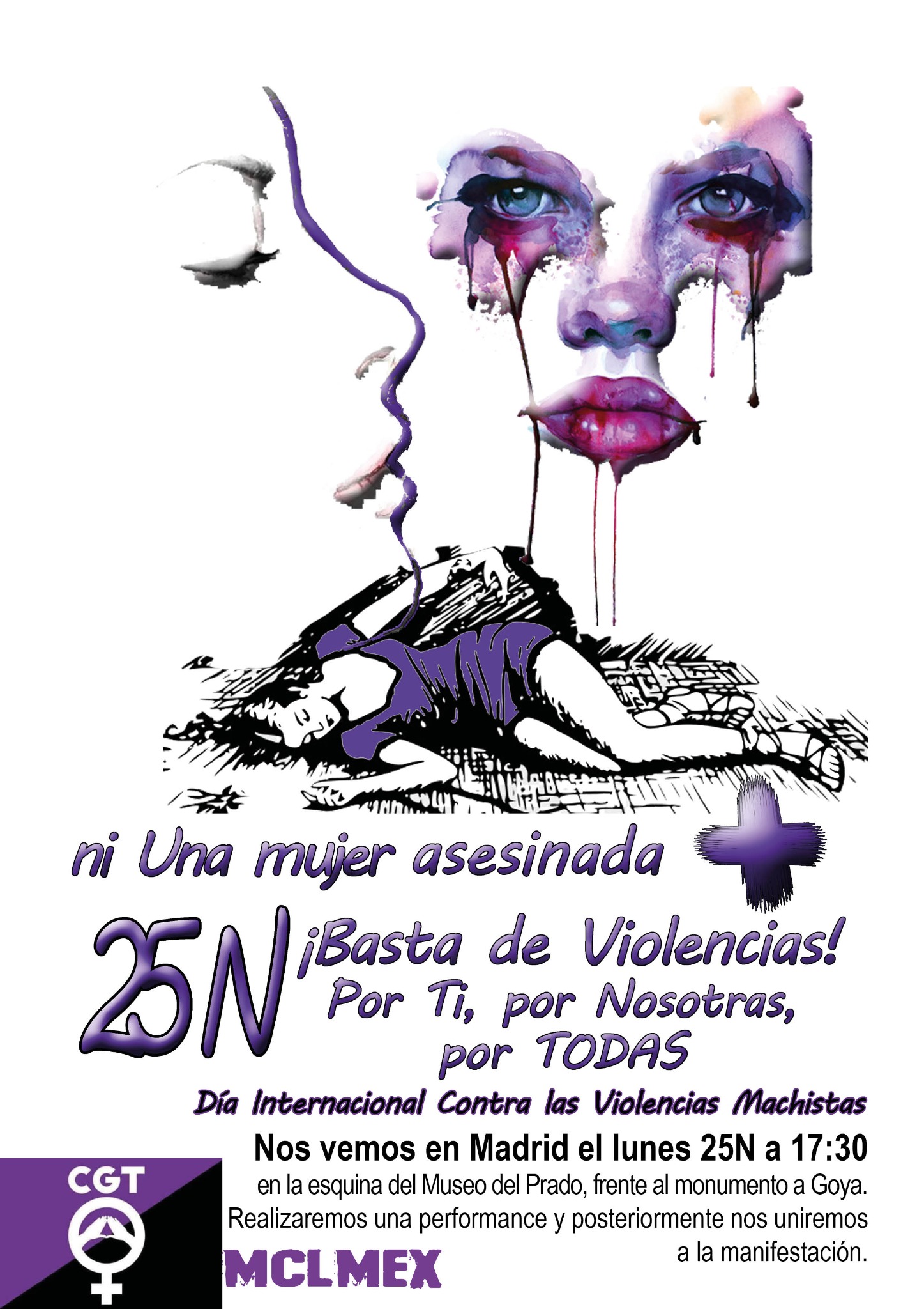 Desde CGT como todos los años nos uniremos a la manifestación por la tarde, quedando a las 17:30 horas en la esquina del Museo del Prado, colindante con la calle Felipe IV, frente al Monumento a Goya donde las mujeres de CGT vamos a hacer una PERFORMANCE en contra de la violencia machista.