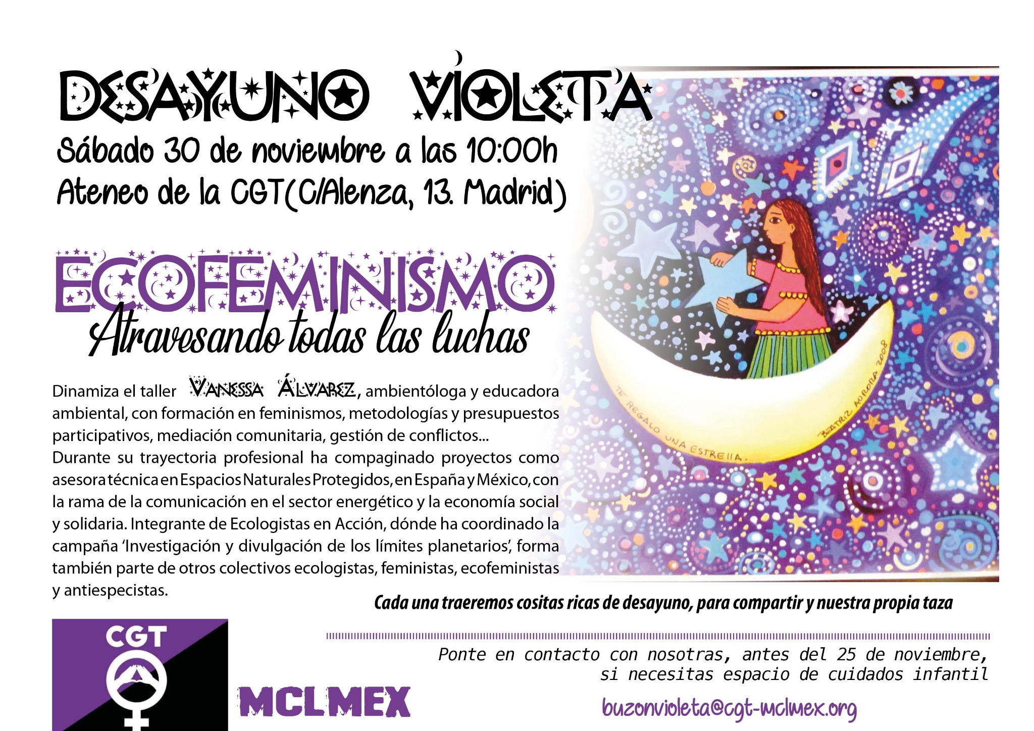 Desde la Secretaría de la Mujer de CGT MCLMEX te invitamos a nuestro tercer Desayuno Violeta que tendrá lugar el próximo sábado 30 de Noviembre a las 10 horas en el Ateneo (C/Alenza,13).