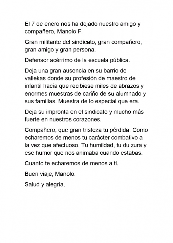 Manolo Fuertes, nuestro compañero, amigo y militante desde hace años en nuestro sindicato falleció. Manolo era todo un ejemplo de sindicalismo en donde mezclaba su carácter combativo con la humildad que le caracterizaba y que hacía que fuese muy querido, en especial en su barrio de Vallekas. Estuvo de delegado sindical hasta antes de jubilarse y aún jubilado nos seguía echando una mano a seguir repartiendo y militando por su barrio. Era tan especial que su ausencia nos deja bastante dolidas. Que mínimo que dedicarle unas palabras y un sincero adiós.