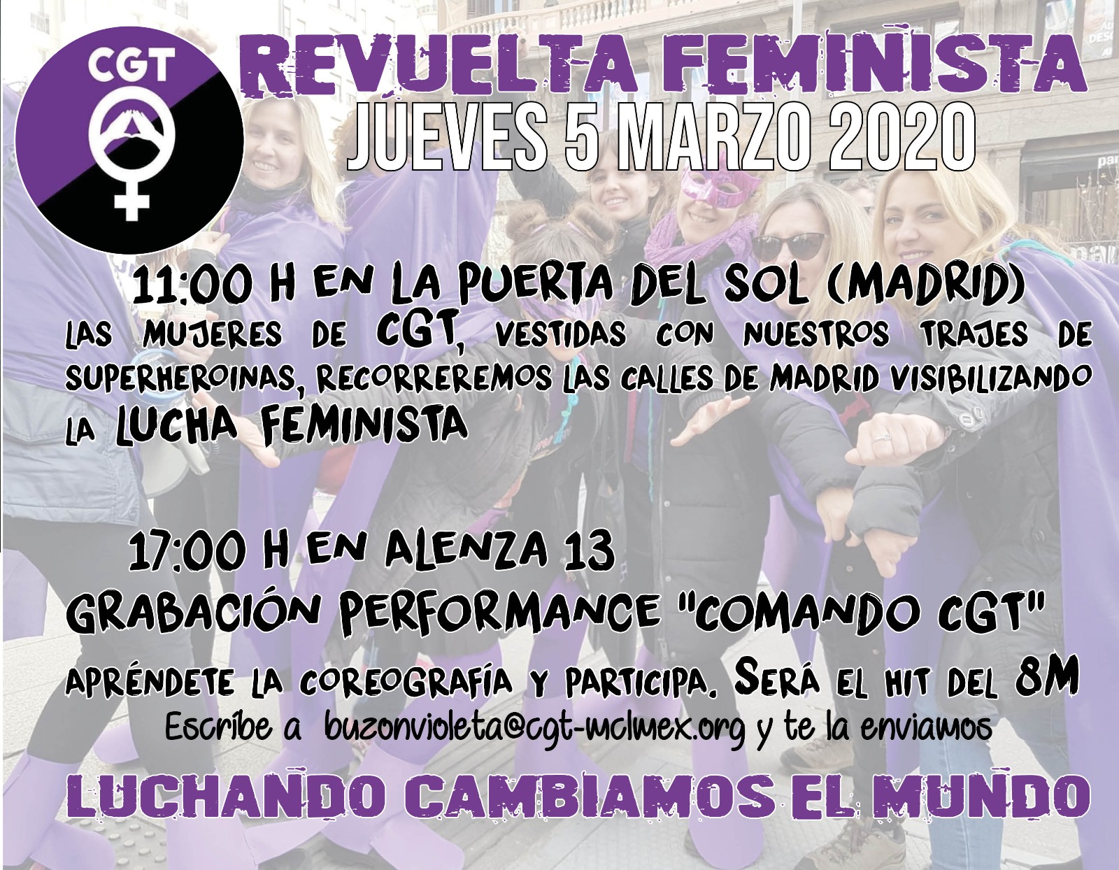 1) Quedaremos a las *11 horas en la Puerta del Sol* con el propósito de repartir el manifiesto del 8M y unas pulseras feministas con el lema de este año—8M-Luchando cambiamos el mundo. Las mujeres de CGT, vestidas con nuestros trajes de superheroinas ??♀️?♀️, recorreremos las calles de Madrid visibilizando la Lucha Feminista; si lo prefieres puedes ir vestida de negro y morado. La idea es formar un grupo grande para que se nos vea actuar.