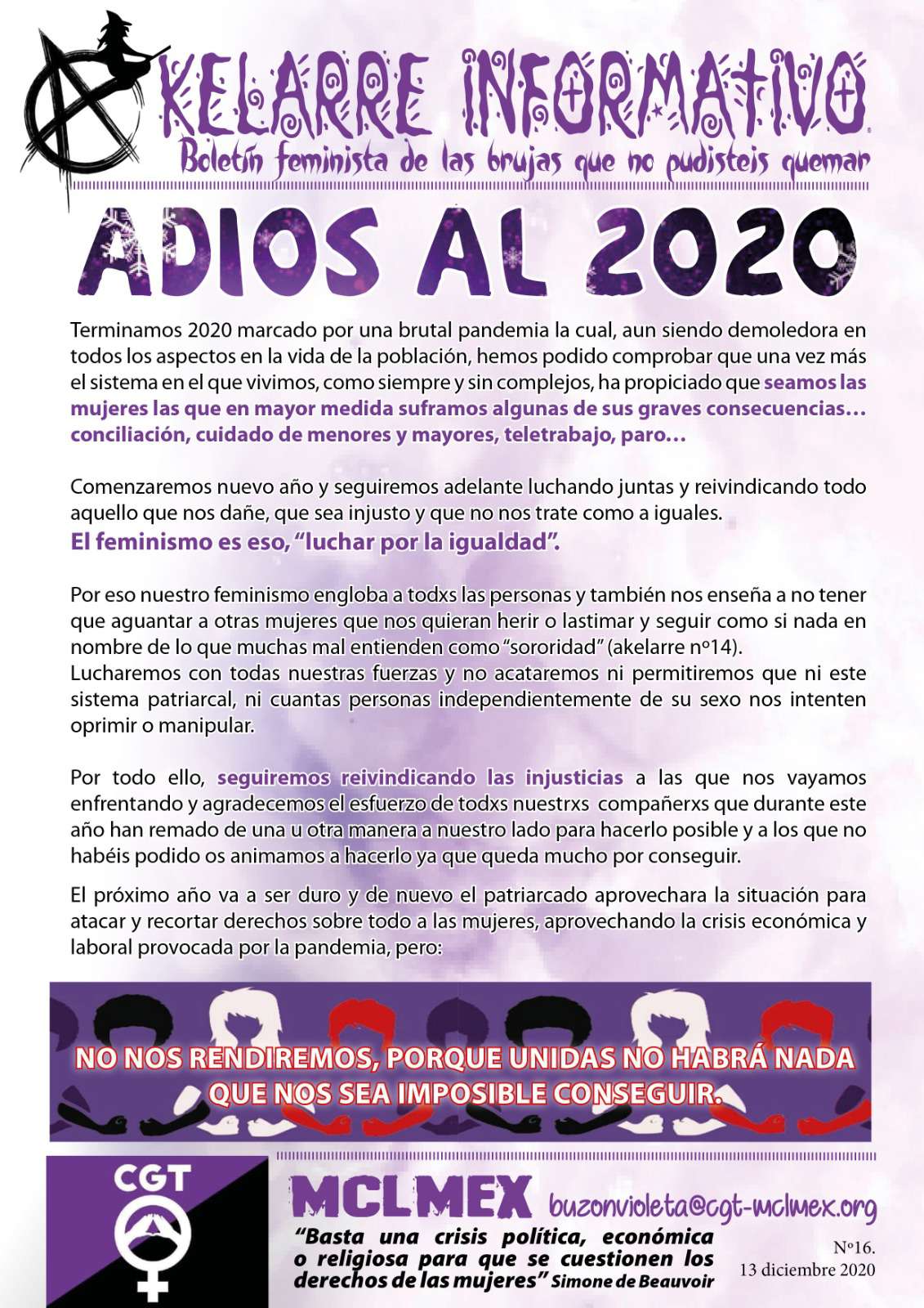 Hoy día 13 de diciembre presentamos el ejemplar Nº16 del AKELARRE INFORMATIVO. Un boletín mensual en el que pueden participar todas las mujeres de CGT y en el que cada mes damos visibilidad a las desigualdades que sufrimos las mujeres y ponemos de manifiesto las maneras para combatirlos.