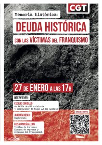 Desde el Secretariado Permanente del Comité Confederal de CGT, se ha organizado una nueva jornada formativa titulada «Memoria histórica: Deuda histórica con las víctimas del Franquismo». que contará con la participación de: