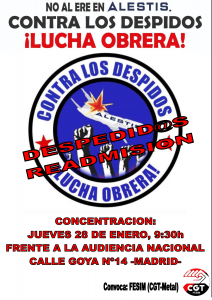 Ante esta situación y en defensa de las compañeras y compañeros que han sido despedidos, desde CGT y desde otras organizaciones sindicales presentes en Alestis, interpusimos una demanda contra el ERE, celebrándose el juicio el próximo 28 de enero, a las 9:30 de la mañana, en la Audiencia Nacional de Madrid (Calle Goya Nº14).