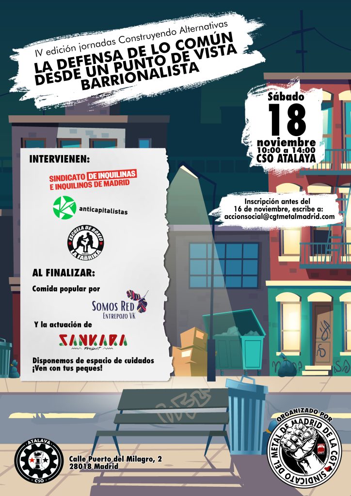 CGT Metal Madrid va a celebrar este sábado 18 de Noviembre desde las 10h a las 14h en el CSO La Atalaya, las IV jornadas de Construyendo Alternativas, esta vez con la temática de «Defensa de lo común desde un punto de vista Barrionalista», con la presencia de Anticapitalistas, La Fábrika de Vallecas y el Sindicato de Inquilinas de Madrid.