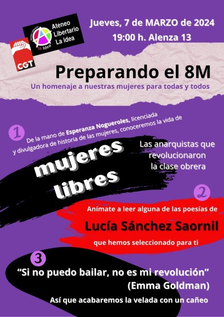 Estimad@s compañer@s, el próximo JUEVES 7 DE MARZO A LAS 19 H con motivo del DIA INTERNACIONAL DE LA MUJER, vamos a celebrar un homenaje a todas aquellas mujeres que pusieron sus vidas al servicio de la emancipación de la mujer, a través del recuerdo del papel que desempeñaron nuestras compañeras de MUJERES LIBRES EN EL MOVIMIENTO LIBERTARIO EN EL MARCO DE LA GUERRA CIVIL y que posteriormente se ha mantenido en la CNT y ahora CGT, con el permanente propósito de la defensa de los derechos de la mujer en todas las facetas de la vida diaria, laboral , social, familiar, etc.
