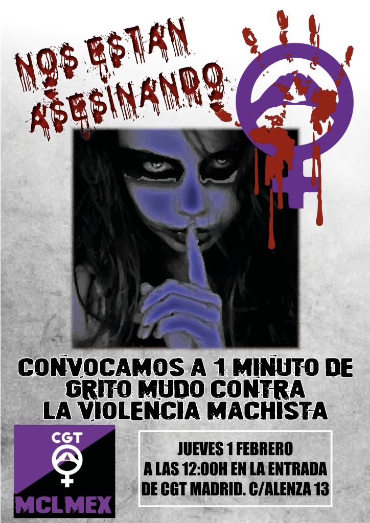 El primer jueves de cada mes como muestra de repulsa ante los feminicidios guardaremos un minuto de silencio. Por ello, pedimos tu presencia el próximo jueves 1 de febrero en la puerta de Alenza a las 12 horas.