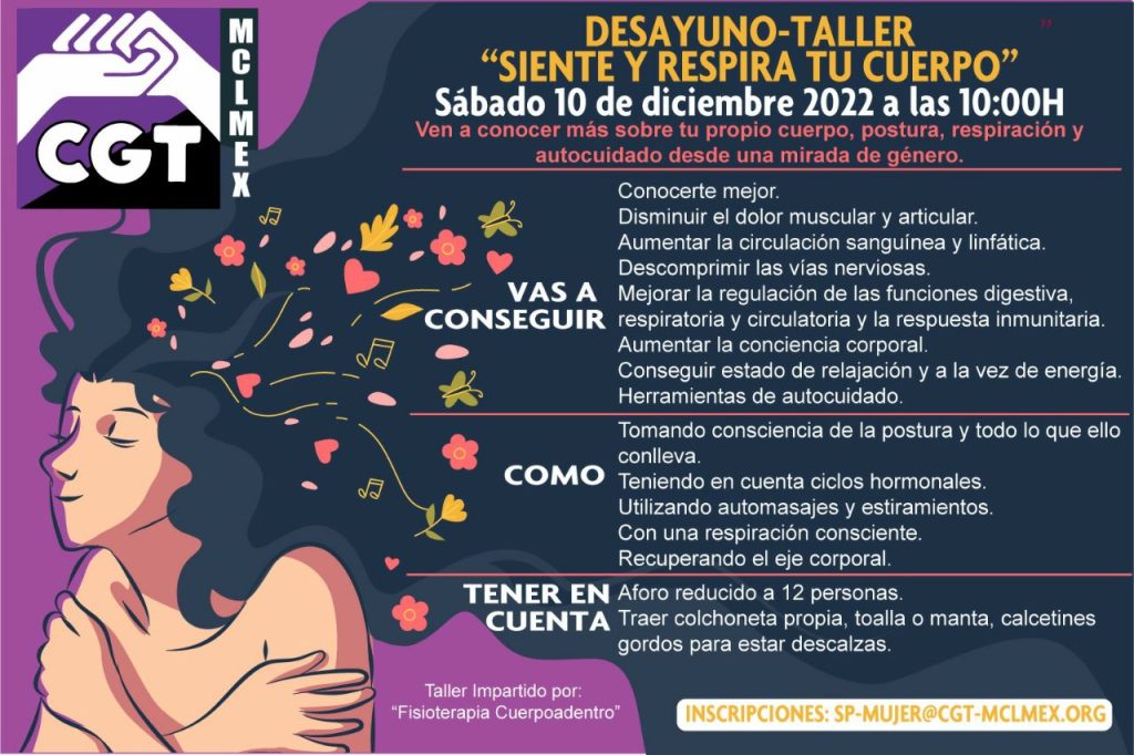 Para poder desarrollar la actividad en buenas condiciones el aforo será limitado, por lo que si te interesa participar, mándanos tus datos a sp-mujer@cgt-mclmex.org.