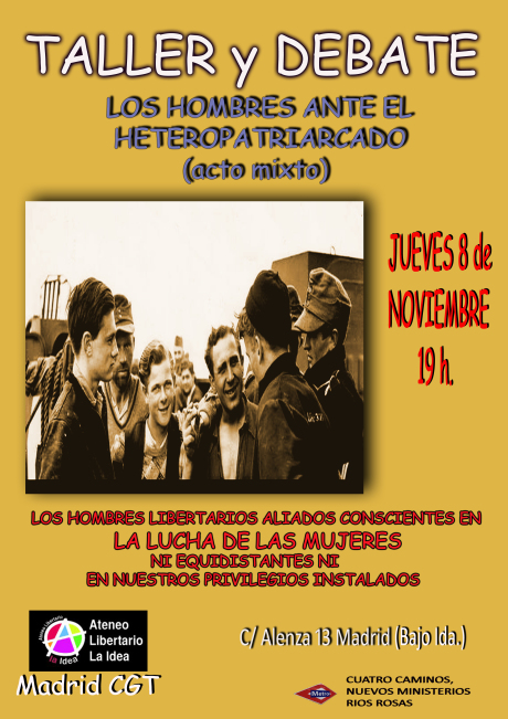 Estimad@s compañer@s, para la sesión del próximo jueves 8 de Noviembre hemos preparado un interesante taller/debate sobre la posición y respuesta de los hombres, y más concretamente los hombres que nos denominamos libertarios en el día a día, ante el heteropatriarcado capitalista instalado en nuestra sociedad y que condiciona de una manera brutal las relaciones interpersonales hombre/mujer, en todas sus facetas, sexo, hogar, empresa, política,etc.