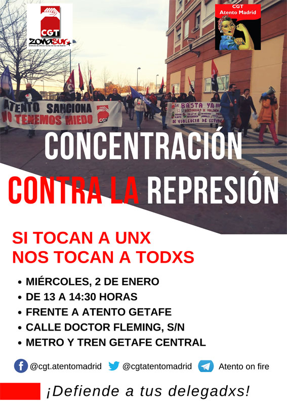 Ayer Atento abrió un expediente contra 2 de nuestras compañeras de la sección sindical de la CGT, en un nuevo intento de reprimir nuestra acción sindical, utilizando como excusa un incidente fortuito que se produjo en el centro de Getafe el 13 de noviembre.