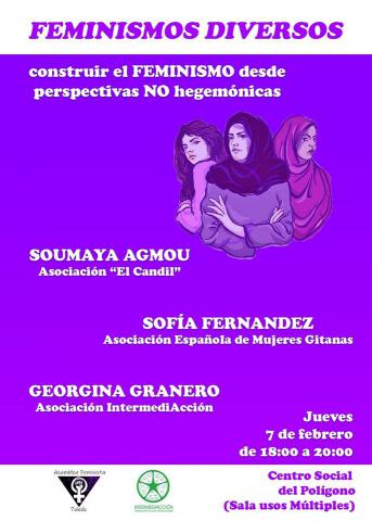 Os invitamos a asistir a la mesa redonda que la Asamblea Feminista de Toledo junto con la Asociación IntermediAcción realizaremos el próximo jueves 7 de febrero. Con el tema de Feminismos diversos participarán Soumaya Aghmou de la Asociación de mujeres magrebíes «El candil», Sofía Fernández de la Asociación Española de Mujeres Gitanas y Georgina Granero de la Asociación IntermediAcción.