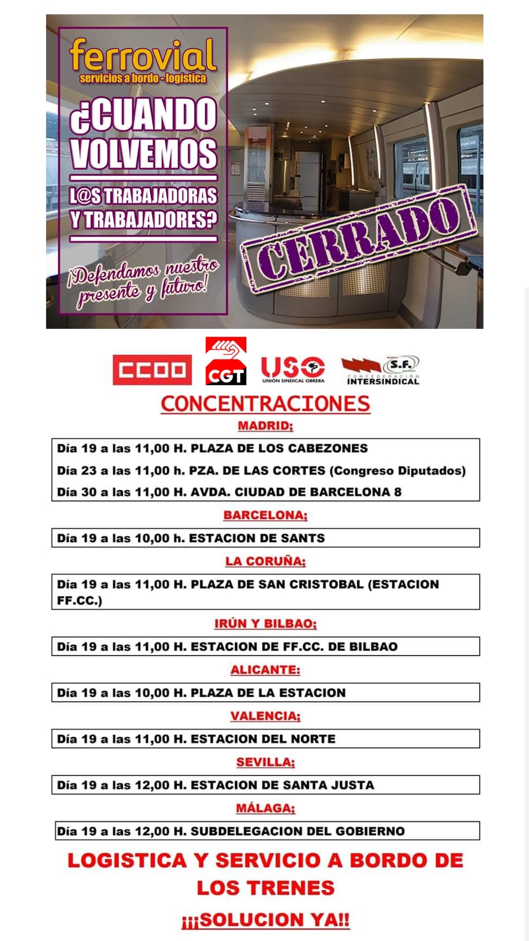 Tras la declaración del Estado de Alarma y la consiguiente eliminación de las prestaciones de Servicios a Bordo en los trenes AVE y Larga Distancia, la empresa Ferrovial estableció un ERTE para la plantilla que prestaba estos servicios. Una vez que se ha anunciado el Plan de Desescalada, y más concretamente en los aspectos que regulan el transporte ferroviario, la vuelta a la normalidad parece que no va a pasar por el restablecimiento de los servicios a bordo ni la parte de logística que complementa esta prestación.