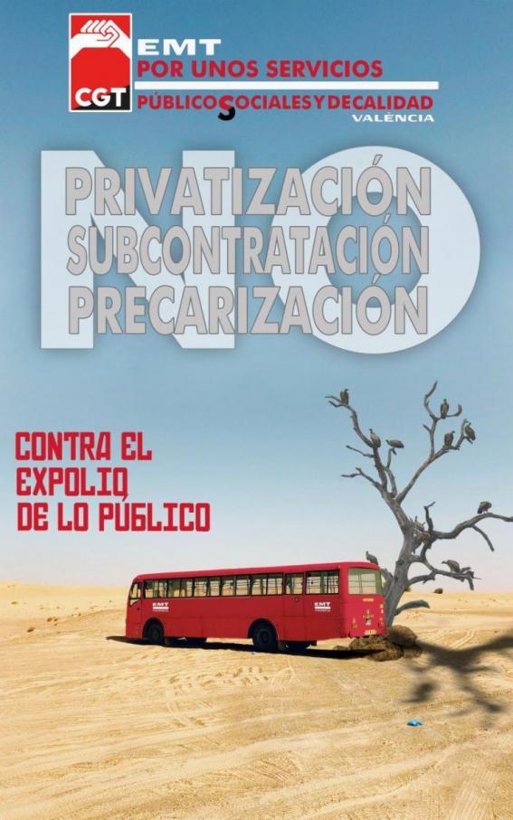 La asamblea de trabajadores de EMT València ratificó el martes la propuesta del Comité de empresa de realizar paros de 2, 4, 6 y 8 horas por turno a partir del próximo 15 de setiembre. Representantes de los trabajadores de la empresa municipal informan que esta convocatoria viene dada por la falta de ratificación del preacuerdo de convenio suscrito el 13 de marzo, el incumplimiento del acuerdo del 21 de agosto por la externalización de los trabajos del Área Técnica, el impago de la prima de absentismo, de primas de formación y días de convenio de 2019, la eliminación de los wáteres provisionales, la mejora de la limpieza y el mantenimiento y la mayor protección frente a la COVID-19. Desde la sección sindical de CGT en EMT explican que respaldan esta decisión, ya que “se trata de un servicio esencial y como sociedad no se puede permitir el expolio de lo público”.