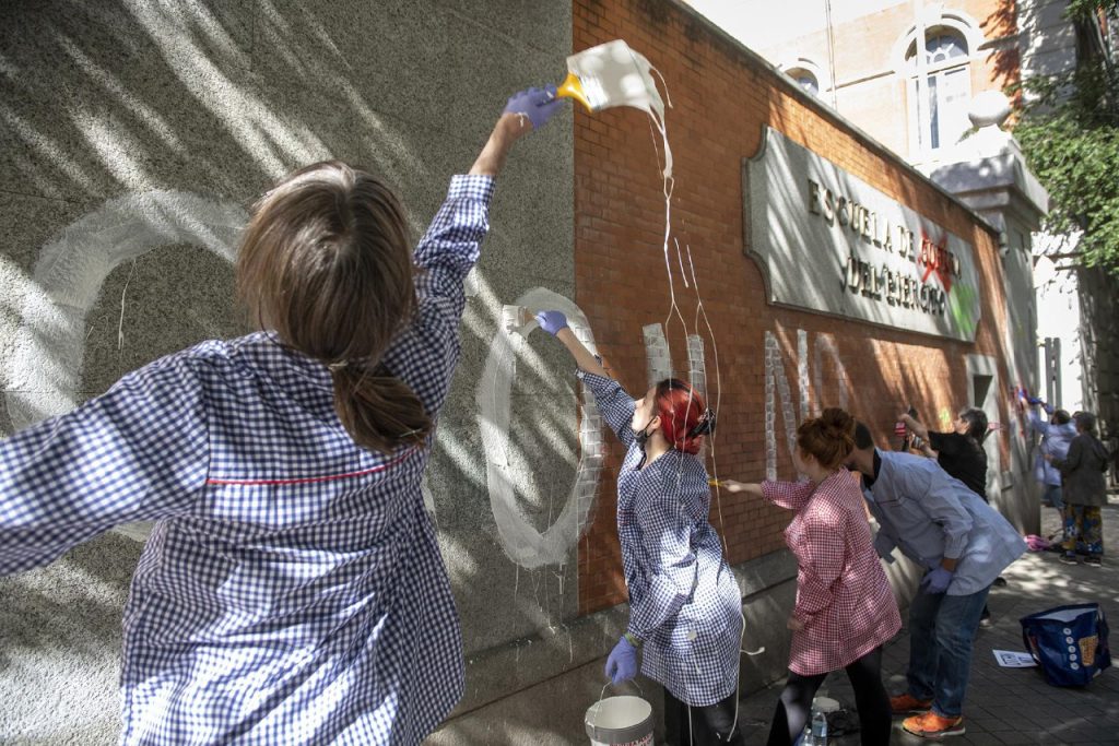 En la acción directa, promovida por Desarma Madrid, participaron activistas y militantes de diversas organizaciones como Alternativa Antimilitarista – MOC, Ecologistas en Acción, Mujeres de Negro contra la Guerra Madrid, Yayoflautas Madrid, BDS Madrid, Fridays For Future, CSOA La Enredadera y CGT. Vestidos con “amenazantes babis escolares, se reunieron para pintar consignas a favor de la paz y en contra de la OTAN en esta instalación militar, desplegar dos pancartas y realizar bailes y cánticos infantiles alusivos” y así reconvertir simbólicamente la Escuela de Guerra en Escuela de PAZ.