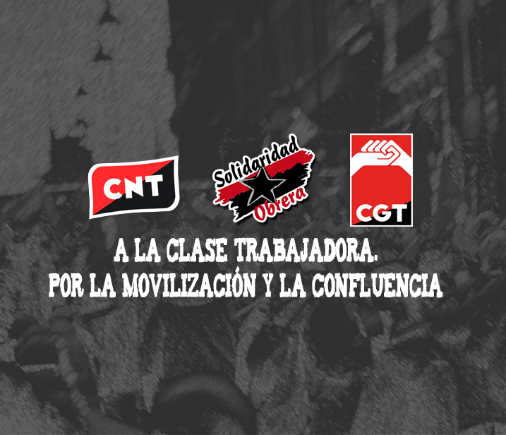La Confederación General del Trabajo (CGT), la Confederación Nacional del Trabajo (CNT) y la Confederación Sindical Solidaridad Obrera hemos decidido superar el aislamiento que nos impone la dinámica de las luchas parciales y centrarnos en lo que tenemos en común. Superar las movilizaciones dispersas e intentar desbordar al sindicalismo oficialista fomentando un gran proceso conjunto de movilización del sindicalismo combativo. Hacemos un llamamiento a la clase trabajadora para que luche por sus derechos y conquiste su emancipación, en estos momentos de crisis, por medio de la lucha y la unidad de acción.