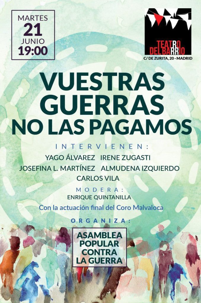 Os convocamos y nos convocamos a compartir un conversatorio, en El Teatro del Barrio el 21 de junio a las 19:00 horas, en el que contaremos con: Yago Álvarez, periodista y economista, Josefina L. Martínez, periodista e historiadora, Irene Zugasti, periodista y politóloga, Almudena Izquierdo activista por los Derechos Humanos y antimilitarista, y Carlos Vila, abogado que participó activamente en el referéndum de 1986 y en la construcción del movimiento contra la entrada en la OTAN. Será moderado por Enrique Quintanilla, activista social participante en la Asamblea Popular contra la Guerra.