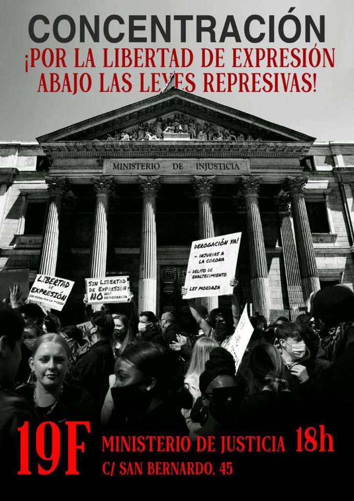 El 19 de febrero nos concentramos frente al ministerio de justicia. Exigimos la derogación de la larga lista de leyes represivas, luchamos por la libertad de expresión cuya falta ha hecho que Pablo Hasél lleve casi un año encarcelado.