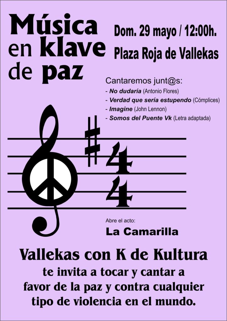 El próximo domingo día 29 de Mayo a las 12 h se va a celebrar un concierto en la Plaza Roja de Vallekas «Música en klave de paz», para cantar y tocar contra cualquier tipo de violencia y contra todo tipo de guerras en el mundo.