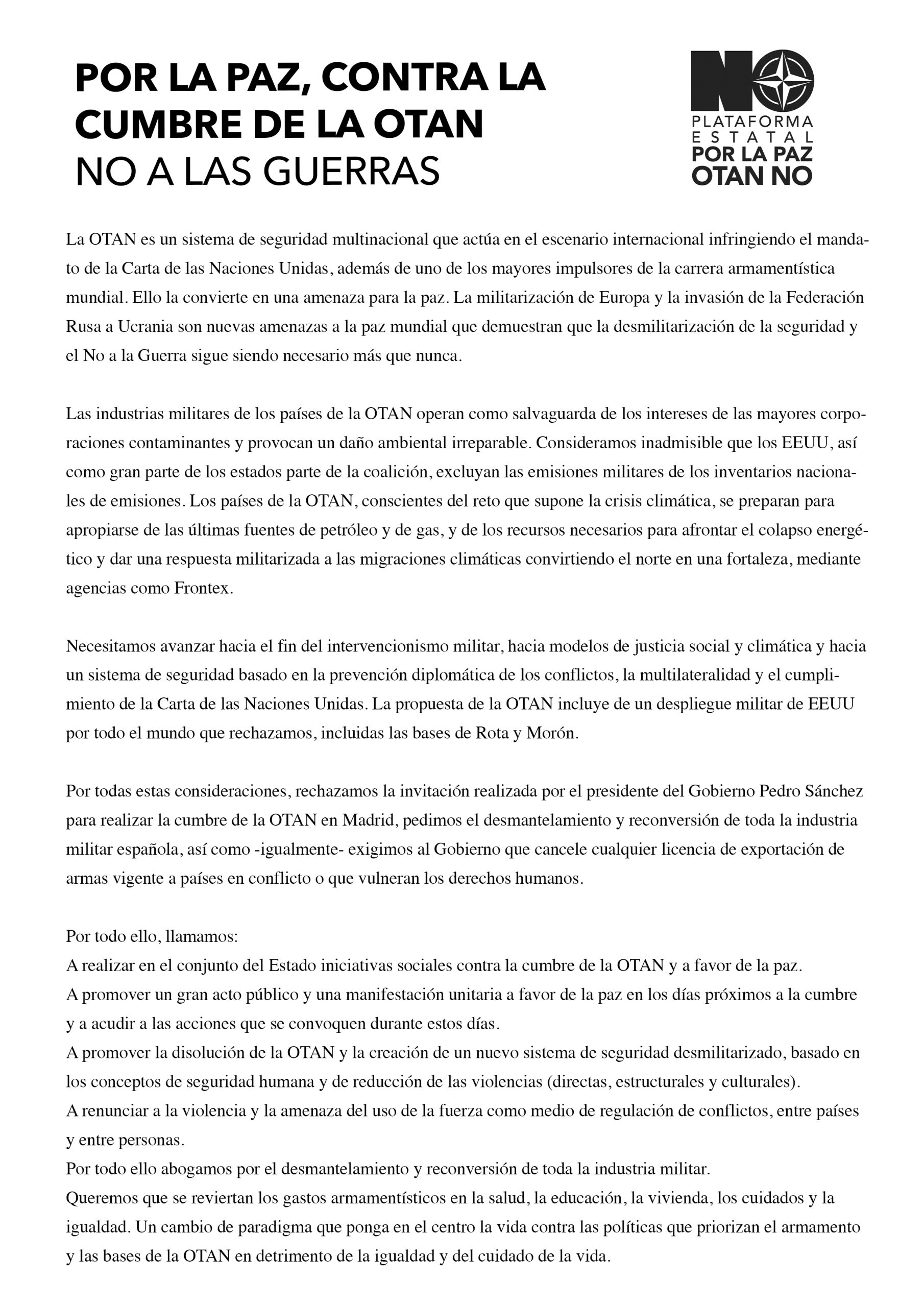 1], Ecologistas en Acción, Anticapitalistas, ATTAC o CRT han creado esta plataforma para canalizar sus acciones, coincidiendo con la invasión de Ucrania y meses antes de la Cumbre de la OTAN que se celebrará en Madrid los días 29 y 30 de junio.