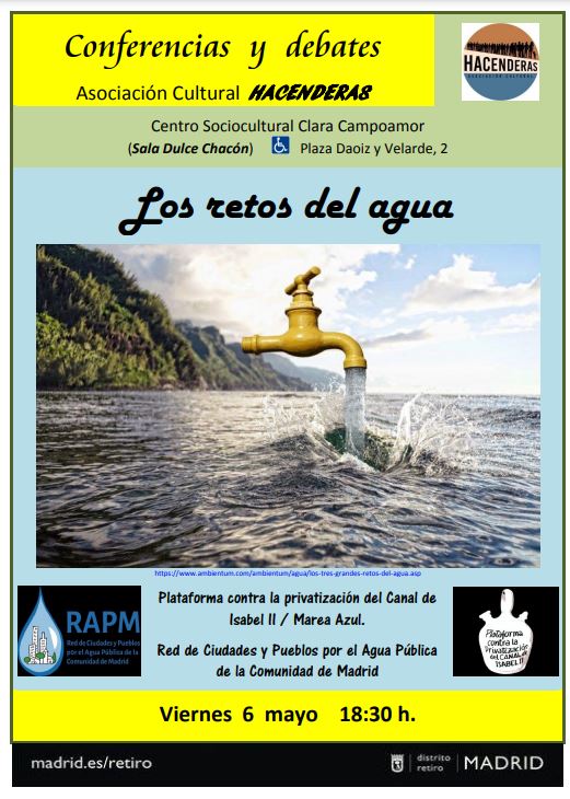 Los Retos del Agua: Viernes 6 de mayo a las 18:30 h. en Asociación Cultural Hacenderas, en  el Centro Sociocultural Clara Campoamor, plaza Daoiz y Velarde 2