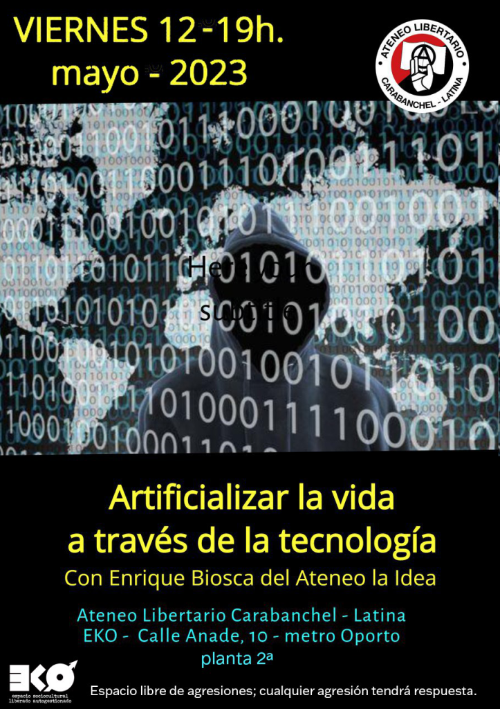 El viernes día 12 nuestro compañero Enrique expondrá en el Ateneo Libertario Carabanchel-Latino EKO, el estudio y análisis que en su día realizamos en este Ateneo sobre el impacto tan importante que ha tenido y tiene el desarrollo de la tecnología en nuestras vidas.