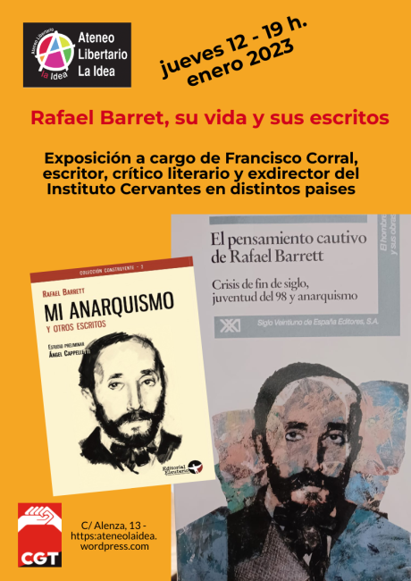 Estimad@s amig@s y compañer@s, empezamos las actividades en el nuevo año con la figura de RAFAEL BARRET, escritor, periodista y ensayista español que desarrolló la mayor parte de su producción literaria en Paraguay, por lo que es considerado una figura destacada de la literatura paraguaya a principios del siglo xx. Es particularmente conocido por sus cuentos y sus ensayos de hondo contenido filosófico, exponente de un vitalismo que anticipa de cierta forma el existencialismo. Conocidos son también sus alegatos filosófico–políticos
