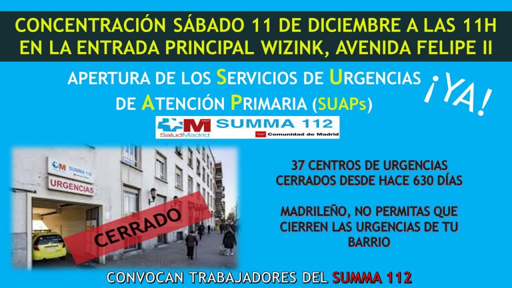 LOS TRABAJADORES DEL SUMMA 112 convocan una nueva concentración para exigir la apertura inmediata de los Servicios de Urgencias de Atención Primaria (SUAPs), tras casi 21 meses cerrados, negando a la población madrileña el poder acudir a un centro sanitario cerca de su domicilio cuando los Centros de Salud están cerrados en el caso de una urgencia.