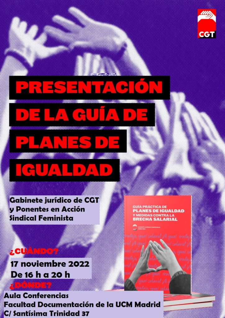 Las secretarías de Formación, Mujer y Jurídica, junto al Gabinete Jurídico de CGT, hemos organizado el curso y presentación de la “Guía Práctica de Planes de Igualdad y Medidas contra la Brecha Salarial” que se celebrará el 17 de noviembre de 2022, de 16h a 20h, en el Aula de Conferencias de la Facultad de Documentación de la Universidad Complutense de Madrid, C/ Santísima Trinidad, nº37 , 28010- Madrid.