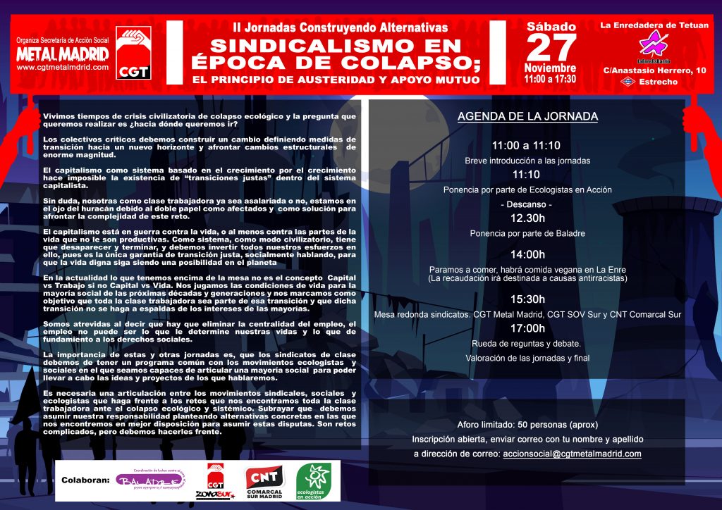 El próximo sábado 27 de noviembre desde CGT Metal Madrid se han organizado las II Jornadas Construyendo Alternativas, junto con lxs compañerxs de Baladre, CNT Comarcal Sur y Ecologistas en Acción de Madrid, bajo el marco SINDICALISMO EN TIEMPOS DE COLAPSO, EL PRINCIPIO DE AUSTERIDAD Y APOYO MUTUO.