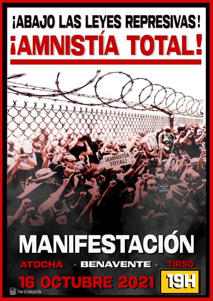 Desde hace ya unos años varios colectivos y organizaciones madrileñas salimos a las calles en octubre para exigir la amnistía total de los presos políticos, así como los derechos y libertades democráticas que el Régimen nos niega. Este año volvemos a salir con aun más motivos si cabe. El actual Gobierno de Unidas Podemos y PSOE no solo no ha cumplido ni una sola de sus promesas en materia antirrepresiva, sino que la vorágine represiva del Estado, lejos de aflojar, cada vez se endurece más, lo cual hace que cada año aumente drásticamente la cifra de personas represaliados y presas políticas.