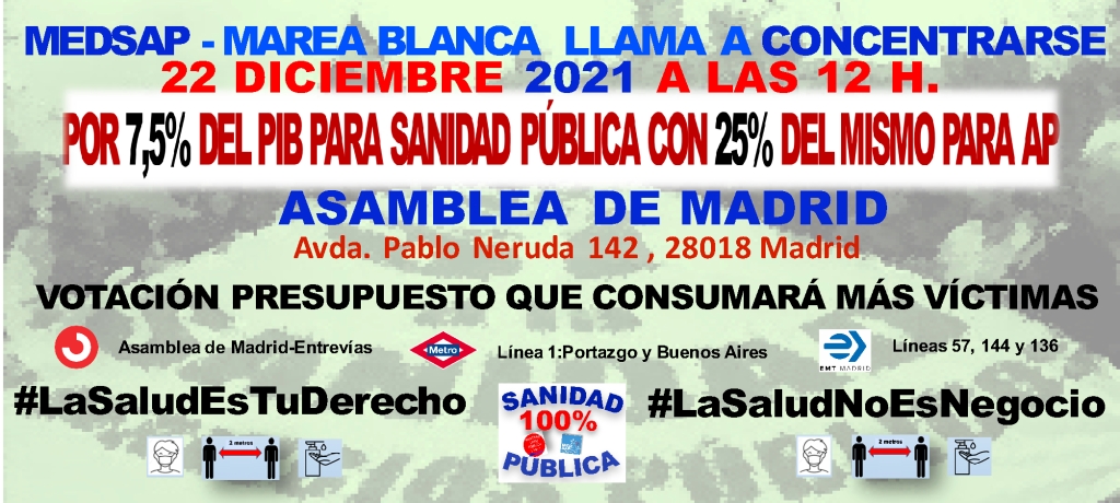 Información: https://mesaendefensasanidadpublica.wordpress.com/2021/12/20/presupuestomanipuladoderechosaludabandonado-21-y-22-12-sendas-concentraciones-en-asamblea-madrid/