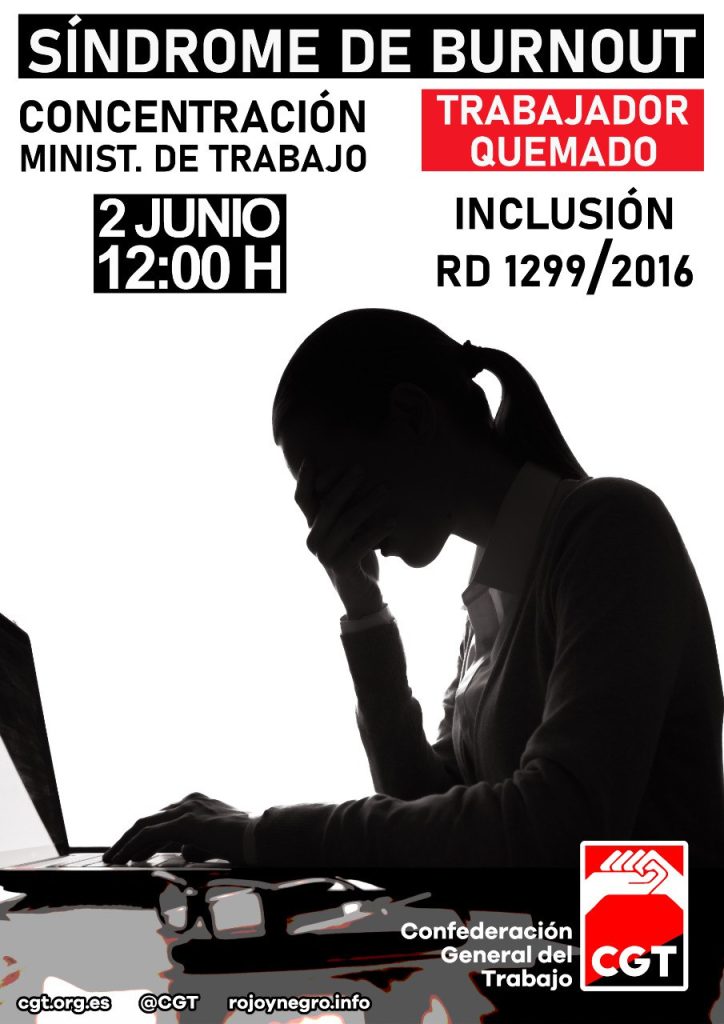 La Confederación General del Trabajo (CGT) hará entrega este día 2 de junio de 2022, durante la concentración que se celebrará frente al Ministerio de Trabajo y Economía Social, a la titular de dicho ministerio, Yolanda Díaz, un documento en el que exige la inmediata inclusión del “síndrome de Burnout” -comúnmente conocido como “síndrome del trabajador quemado”- en la legislación actual por ser una enfermedad considerada por la OMS en 2019, en el marco de la celebración de la asamblea de esta organización el 25 de mayo, como una dolencia vinculada a las dificultades para el control de la vida.