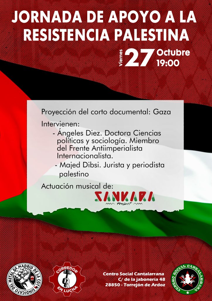 El viernes 27 de noviembre CGT Metal de Madrid con los compañeros de Henares en lucha realizan realizan una jornada en «Apoyo a la Resistencia Palestina». En él, se proyectará el corto llamado Gaza, posteriormente intervendrán Ángeles Diez y Majed Dibsi y finalizará con el grupo de música palestino «Sankara Project»