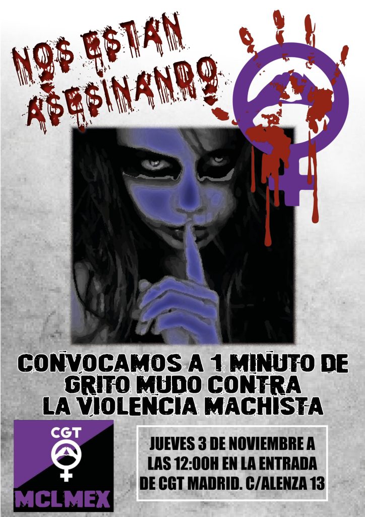 El primer jueves de cada mes como muestra de repulsa ante los feminicidios guardaremos un minuto de silencio. Por ello, pedimos tu presencia el próximo jueves 3 de Noviembre en la puerta de Alenza a las 12 horas.