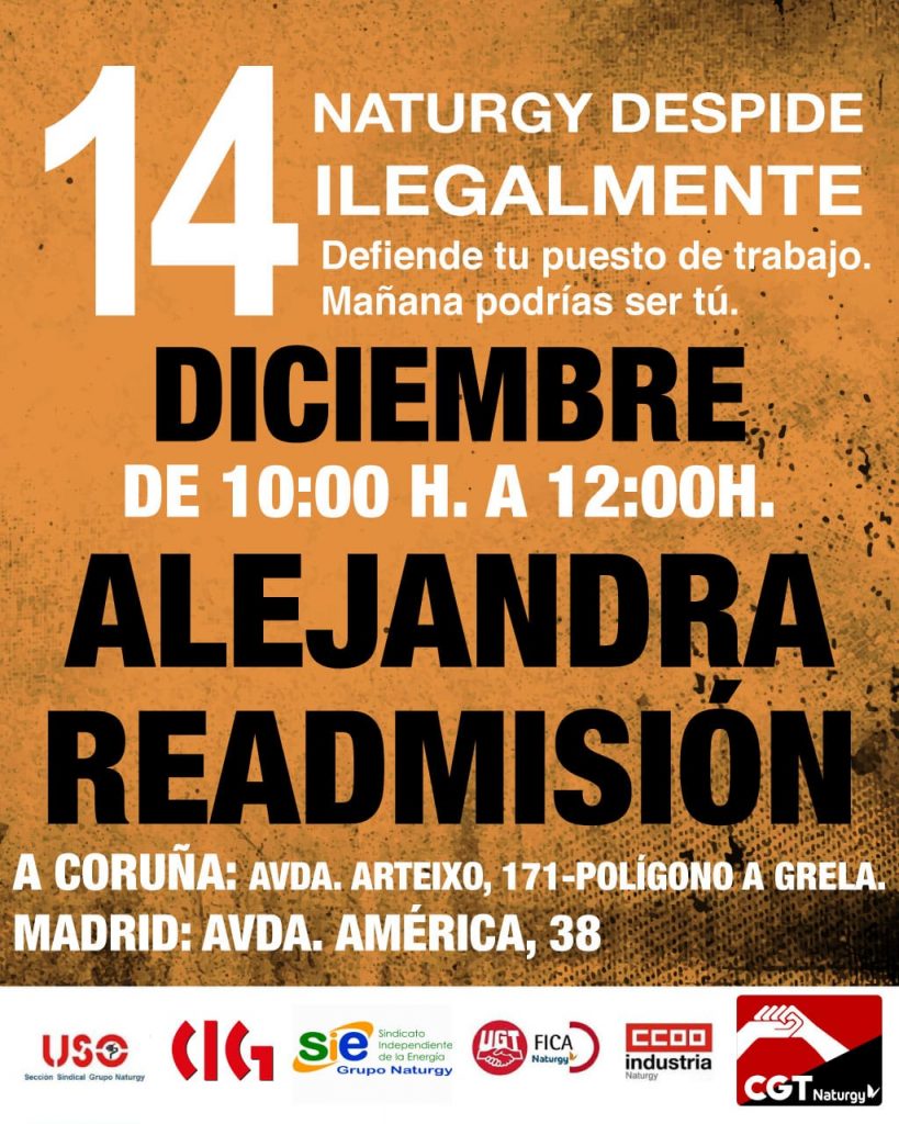 Debido a esto los sindicatos presentes en la empresa han convocado una concentración a las 10 horas de repulsa al despido de la compañera, y en apoyo a la misma para el día 14 de Diciembre en la sede social de Naturgy en la Avda. de América, 38