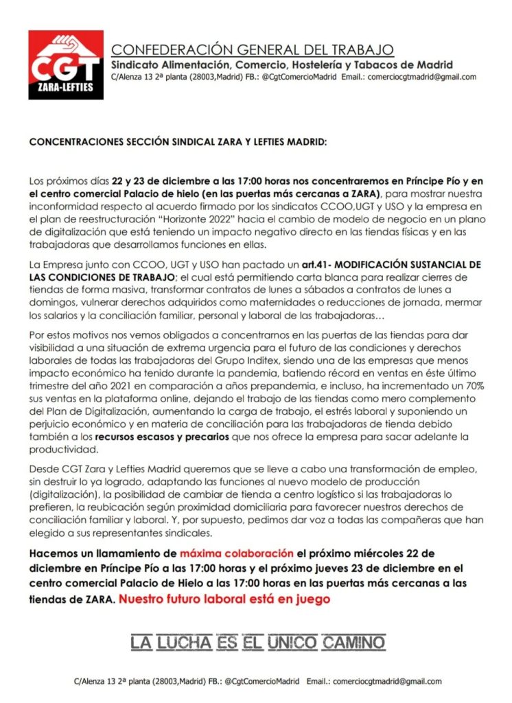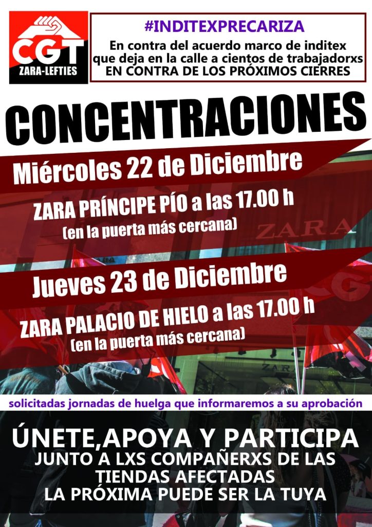 En contra del acuerdo marco de Inditex que deja en la calle a cientos de trabajadores y trabajadoras, CGT convoca la concentración el día 22 en el ZARA de Príncipe Pío