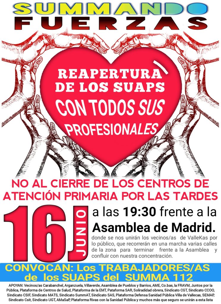Ante la situación insostenible que están sufriendo tanto l@s Trabajador@s del SUMMA 112 como l@s Usuari@s de la Sanidad Madrileña con unos Servicios Sanitarios cada vez más deficitarios en los cuales es imposible dar la atención Sanitaria a la que l@s Usuari@s tienen derecho y sufriendo l@s trabajador@s del SUMMA 112 el maltrato constante por parte de la Administración de la Comunidad de Madrid, l@s trabajador@s del SUMMA 112 han convocado una Concentración el día 16 de junio a las 19,30h frente de la Asamblea de Madrid para manifestar nuestra repulsa por los más de 2 años que los SUAPS llevan cerrados (todo esto con una Pandemia sin precedentes de por medio).