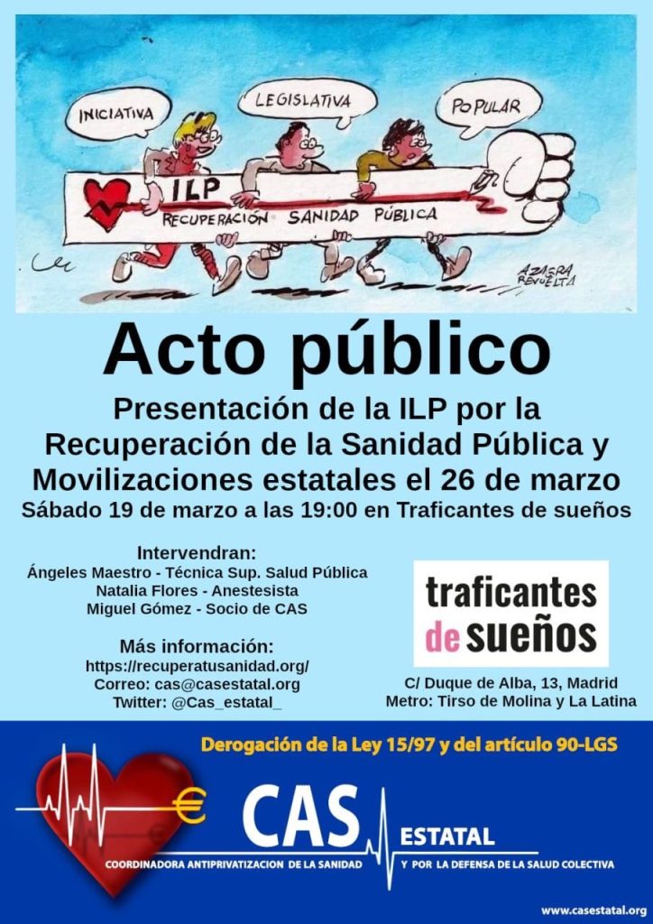 El sábado 19 de marzo, a las 19:00 horas, en Traficantes de Sueños, tendrá lugar un acto de presentación de la ILP por la Recuperación de la Sanidad Pública, así como de las movilizaciones descentralizadas convocadas en todos los territorios.