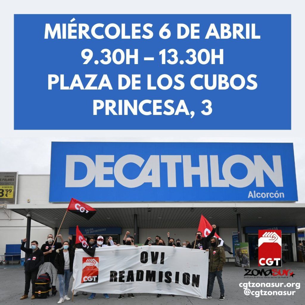 Hemos convocado una concentración en la plaza de los Juzgados (C/Princesa nº 3) el día 6 de abril a las 9:30 horas, día en el que tendrá lugar el juicio de nuestro compañero, en repulsa de las políticas de represión llevadas a cabo no solo por Decathlon, si no por la mayoría de las multinacionales que operan en el estado español, y que con total impunidad ejercen sistemáticamente estas políticas. Necesitamos el apoyo de tod@s para que se replanteen esta manera de actuar, y para que entiendan que no nos vamos a quedar quietos ante semejantes políticas, y que les quede claro que ninguna de estas agresiones va a caer en el olvido.